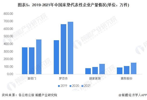 2019-2021年我国床垫行业代表性企业床垫产量总体呈上升趋势。2021年喜临门床垫产量458.68万件,同比增长29.27%;梦百合床垫产量695.34万件,同比增长4.99%;顾家家居床垫产量137.44万件,同比增长44.31%;慕斯股份床垫产量153.92万件,同比增长43.46%。综合来看,2021年梦百合床垫产量在上述四家代表性企业中最大,喜临门床垫产量增速最快。