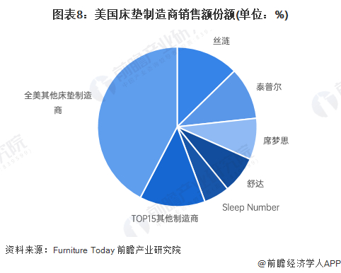 根据今日家居的统计,2020年全美床垫销售量中,TOP15品牌总计占比57.6%,其中丝涟占比12.7%,泰普尔占比10.6%,席梦思占比8.4%,舒达占比7.5%,与出货量排名基本一致。