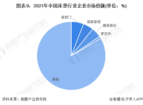 根据床垫市场规模及各企业营收数据测算,2021年,中国床垫行业喜临门的市场份额约为6%左右,顾家家居和慕思股份的市场份额均为5%左右,梦百合在1%左右。
