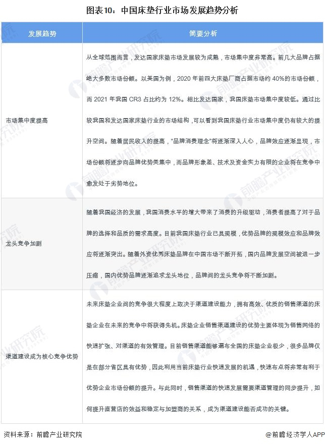 从中国市场来看,我国床垫行业市场将呈现三大趋势:市场集中度提高、龙头竞争加剧以及渠道建设成为核心竞争优势。