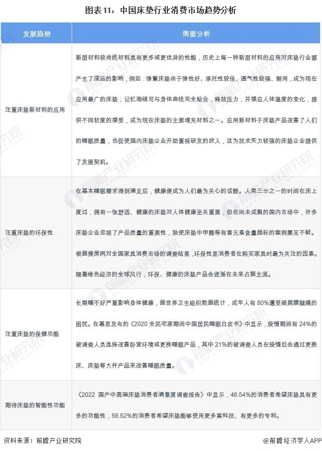 更多本行业研究分析详见前瞻产业研究院《中国床垫行业市场需求预测与投资战略规划分析报告》,同时前瞻产业研究院还提供产业大数据、产业研究、政策研究、产业链咨询、产业图谱、产业规划、园区规划、产业招商引资、IPO募投可研、IPO业务与技术撰写、IPO工作底稿咨询等解决方案。