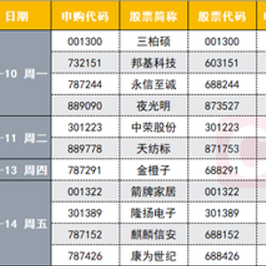 打新时间分布上,下周除周三外每天都有新股申购,其中周一4只(夜光明、邦基科技、三柏硕、永信至诚),周二2只(天纺标、中荣股份),周四1只(金橙子),周五4只(麒麟信安、康为世纪、隆扬电子、箭牌家居)。