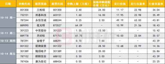 除北交所新股外,顶格申购所需市值前三为箭牌家居(28.5万元)、三柏硕(24万元)、隆扬电子(20万元)。发行价方面,已公布发行价包括永信至诚、邦基科技、箭牌家居、三柏硕、夜光明、天纺标,分别为49.19元、17.95元、12.68元、11.17元、10.99元、10元。