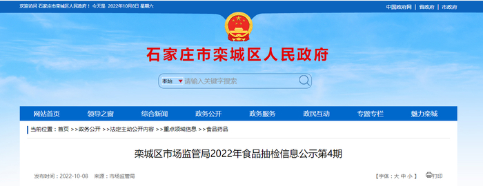 中国质量新闻网讯 10月8日,河北省石家庄市栾城区人民政府网站公布栾城区市场监管局2022年食品抽检信息公示第4期。详见下表。