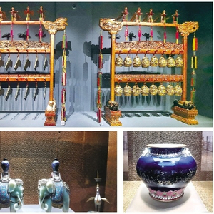 上图:右侧为铜镀金双龙钮云龙纹编钟,编钟是先秦以来历代宫廷雅乐沿用的重器,体现了顺应天地之道而形成的礼乐文化。 左下图:玉雕太平有象,寓意国泰民安。 右下图:清代霁青釉金彩“海晏河清”尊,海晏河清指黄河水流澄清、大海风平浪静,寓意天下太平。 刘同华 摄