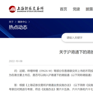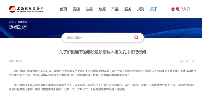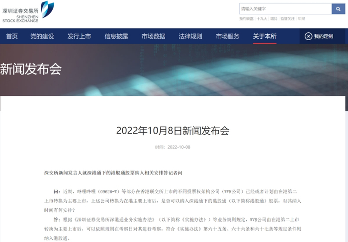 沪深交易所指出,近期,哔哩哔哩等部分WVR公司由在港第二上市转换为主要上市后,可以依照规则在考察日对其进行考察,符合相关规定条件则纳入港股通。
