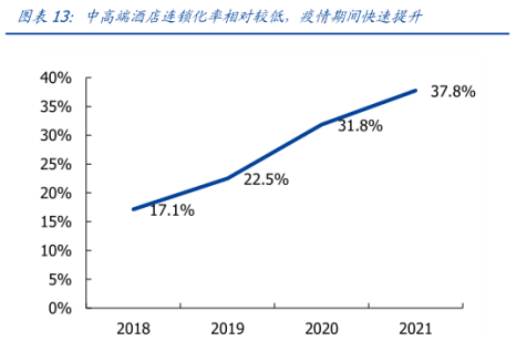 近年来中高端市场规模以及连锁化率稳步提升。2016-2019 年中高端酒店客房数量复合增速为 8.6%,2019 年客房规模为 223.0 万间,但连锁化率相对不高,而自2020年疫情以来快速提升,由2019年22.5%提升至 2021 年的 37.8%