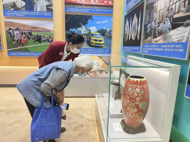 观众在讲解员带领下欣赏牡丹宝相瑞叶花瓶(摄影:四川博物院讲解员郭文荟)