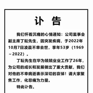 10月8日,据国内多家媒体报道,“华为家事”认证账号在华为内部论坛心声社区发布了一则讣告,宣布公司监事会副主席丁耘因突发疾病于10月7日凌晨不幸去世,享年53岁。