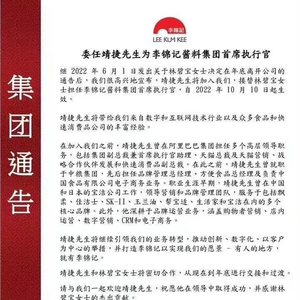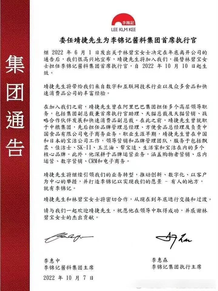 10月7日,李锦记酱料集团发布了任命书,宣布靖捷接替已于今年6月1日通告将离职的林碧宝,担任新首席执行官(CEO),并将在2022年10月10日正式加入李锦记酱料集团就职。