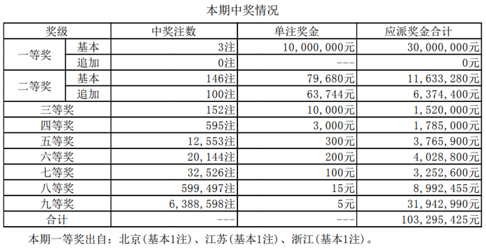 三等奖开出152注,单注奖金1万元。四等奖开出595注,单注奖金3000元。五等奖开出12553注,单注奖金300元。六等奖开出20144注,单注奖金200元。七等奖开出32526注,单注奖金100元。八等奖开出599497注,单注奖金15元。九等奖开出6388598注,单注奖金5元。