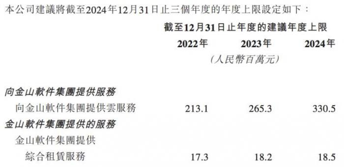 按照协议,2022-2024年,金山云向金山软件提供云服务的建议年度上限,三年下来合计8个多亿。