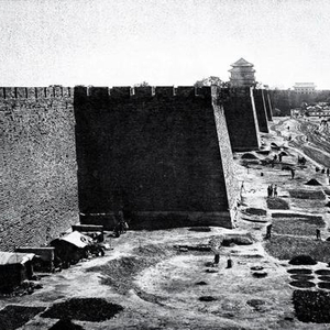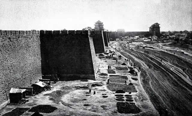 1875年前后,北京内城外的景象。远处是正阳门及其箭楼。高墙下铺着有规则的几何图形,是晾晒的畜粪,墙角下有晒粪人临时搭建的窝棚。图/FOTOE