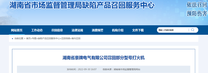 中国质量新闻网讯 据湖南省市场监督管理局缺陷产品召回服务中心网站9月30日消息,日前,湖南省豪牌电气有限公司按照《消费品召回管理暂行规定》的要求,主动向湖南省市场监督管理局报告了召回计划,主将自即日起,召回2021年9月至12月期间生产的“豪牌”V8、P8型号打火机,涉及数量为257500只。