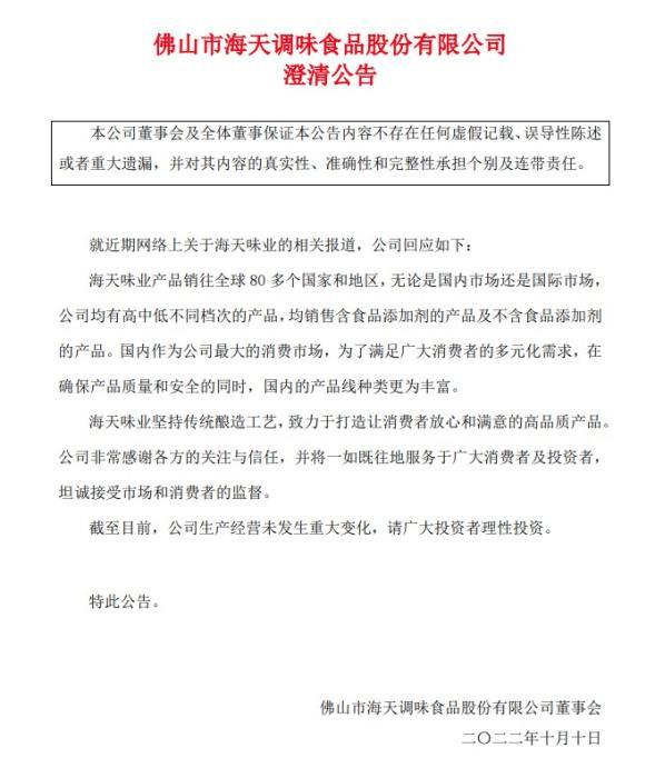 海天味业回应添加剂“双标”问题:国内外均有售含添加剂产品