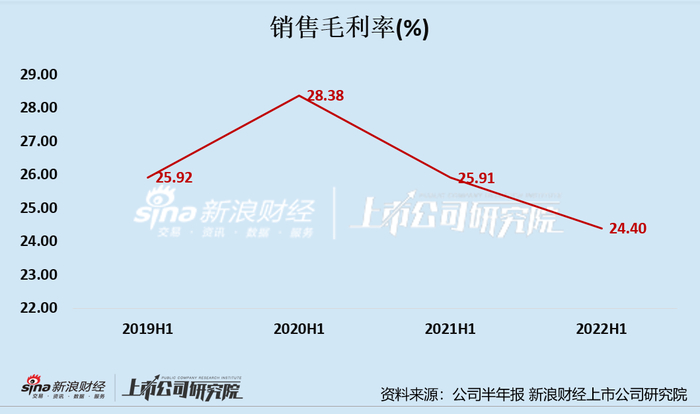受成本较高等因素影响,预制菜行业的毛利率水平并不算高。2019H1-2022H1,味知香的销售毛利率分别为25.92%、28.38%、25.91%、24.40%,两年连续下滑,2021H1-2022H1分别下滑2.47、1.51个百分点。