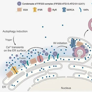 内质网表面钙瞬变/钙振荡是如何决定参与自噬起始的FIP200复合物在内质网上组装?研究发现,自噬诱导条件下,内质网表面发生的钙瞬变/钙振荡触发FIP200复合物发生液-液相分离,形成具有高度动态且易于融合的液滴状FIP200凝聚体。FIP200凝聚体通过与内质网膜蛋白VAPs和ATLs结合,稳定定位于内质网上,并沿着内质网移动,与其他FIP200凝聚体融合。在达到一定大小后,FIP200凝聚体停止融合,成为内质网上的自噬体起始位点,招募下游自噬蛋白,启动自噬体的形成。该研究揭示了内质网表面钙瞬变是决定自噬体在内质网上形成的关键信号,促进了科学家对多细胞生物自噬分子机制的理解,并对探究自噬异常与相关疾病的发生发展以及开发新的治疗策略有重要意义。