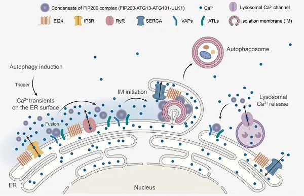 内质网外膜钙瞬变触发FIP200复合物发生液-液相分离,并形成内质网上自噬起始位点的模式图