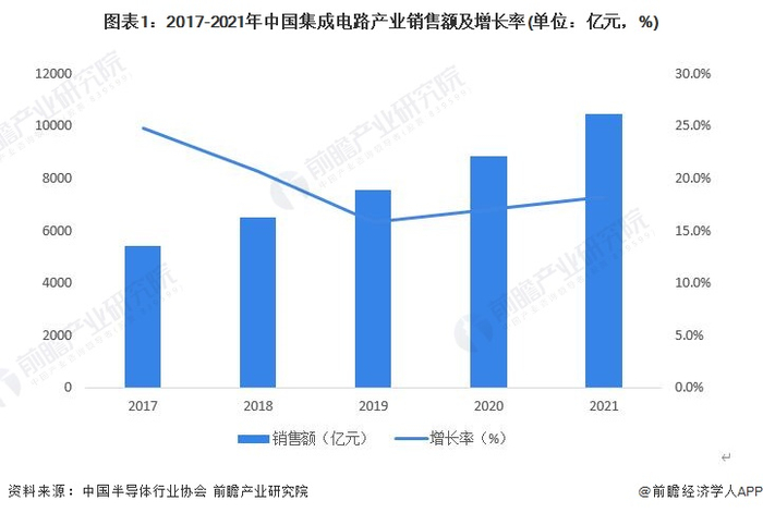 据中国半导体行业协会的数据显示,2017-2021年,中国集成电路产业销售额呈逐年上升的趋势,增长速度维持较高的水平。2021年是中国”十四五”开局之年,在国内宏观经济运行良好的驱动下,国内集成电路产业继续保持快速、平稳增长态势,2021年中国集成电路产业首次突破万亿元。根据中国半导体行业协会统计,2021年中国集成电路产业销售额为10458.3亿元,同比增长18.2%。