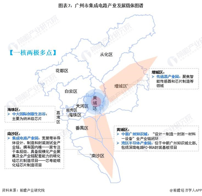 集成电路是广州市大力发展的战略性产业之一。依据《广州市半导体与集成电路产业发展行动计划(2022-2024年)》,广州市集成电路发展格局为“一核两极多点”:以黄埔区为核心,建设综合性半导体与集成电路产业聚集区,围绕集成电路制造,引入和培育一批高端芯片设计、关键材料设备、先进封装测试企业和重点创新平台。以增城区、南沙区为两极,增城区主要聚焦智能传感器和芯片制造等领域,充分发挥高校、新型研发机构的作用,加快大湾区智能传感器产业园项目落地建设;南沙区重点打造宽禁带半导体设计、制造和封装测试全产业链基地。