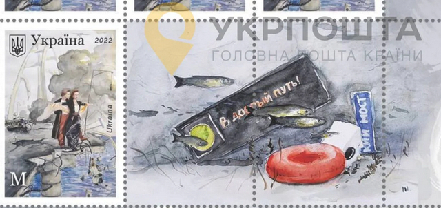 邮票上画着一对情侣站在断裂的桥边,摆着与电影《泰坦尼克号》经典桥段的同款姿势,背后废墟上浓烟滚滚,还有躺在海底的俄罗斯路标和红绿灯。乌克兰国家邮政局在声明中写道:“这一天已经到来:我们将公布一款带有桥的邮票。”