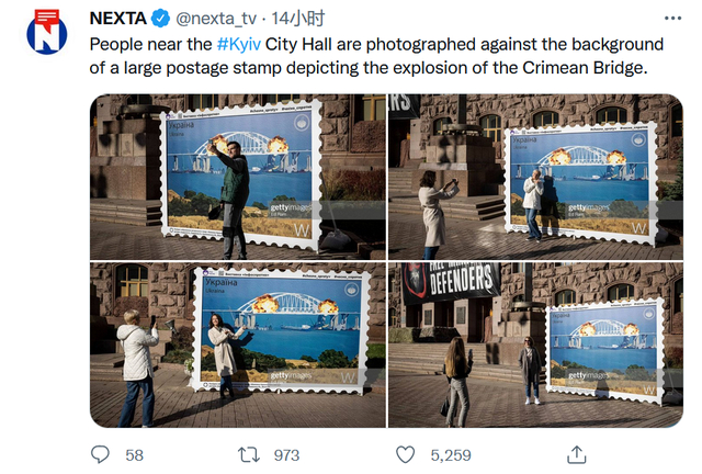 爆炸发生后,乌克兰方面的动向备受关注。8日,白俄媒体“NEXTA”、美媒《纽约时报》等注意到,乌克兰首都基辅的市政厅附近放置了一块以“克里米亚大桥被炸”为主题设计的背景板,当天吸引不少民众前来打卡拍照。