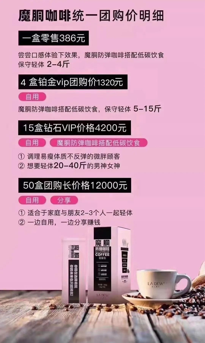 而想要成为魔胴防弹咖啡代理,最低需要12000元,最高级别代理的门槛是32000元,其中最高级别代理的32000元是160盒咖啡,相当于200元一盒。如果单独拿一盒,则是386元,便宜了近一半。