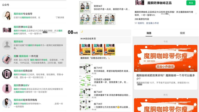 但在微信等公开渠道搜索“魔胴咖啡”,则成了“减肥”的代名词,一盒保守轻体2-4斤,4盒保守轻体5-15斤,15盒轻体20-40斤,且不用节食和运动。