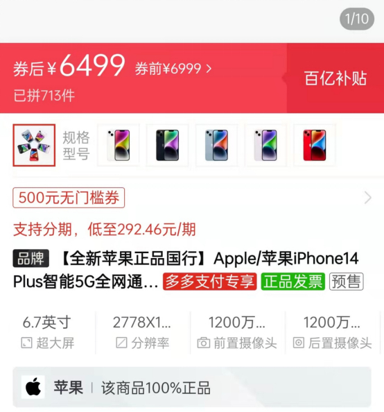 在某电商平台,iPhone 14 Plus领券直降500元,券后价6499元。