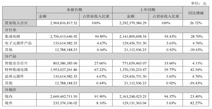 2021年紫光国微上半年按产品划分的营收占比