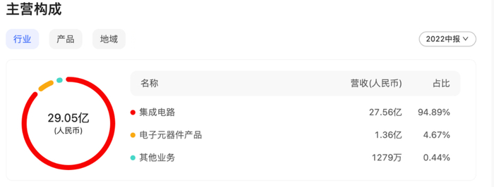 从紫光国微的总营收的业务构成来看,不难发现九成以上的营收都来自于集成电路相关业务,据2022上半年财报数据显示,紫光国微集成电路业务的营业收入约占总收入的94%,而电子元器件产品只占4.67%,其他业务营收占比更是微乎其微。