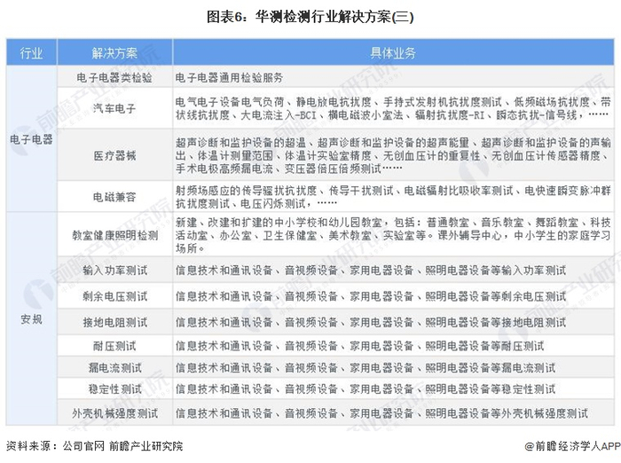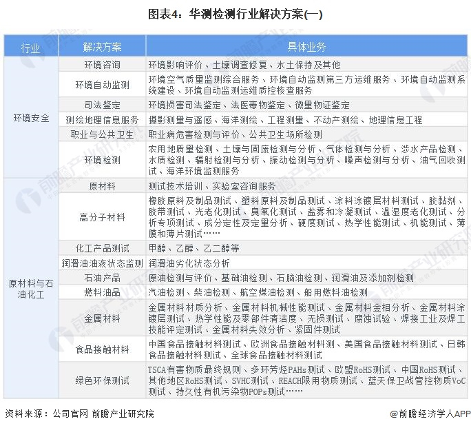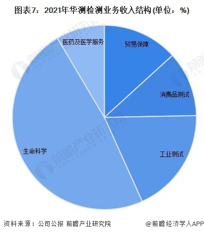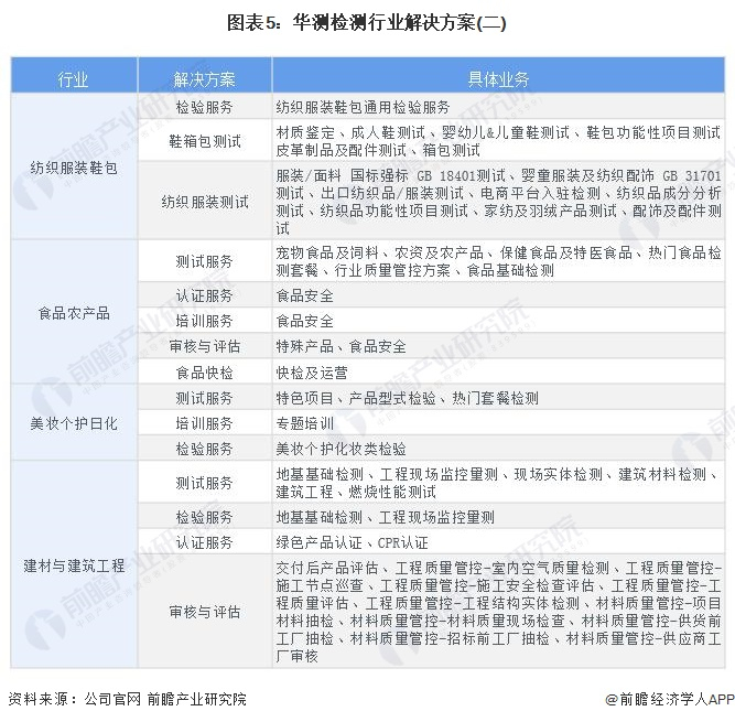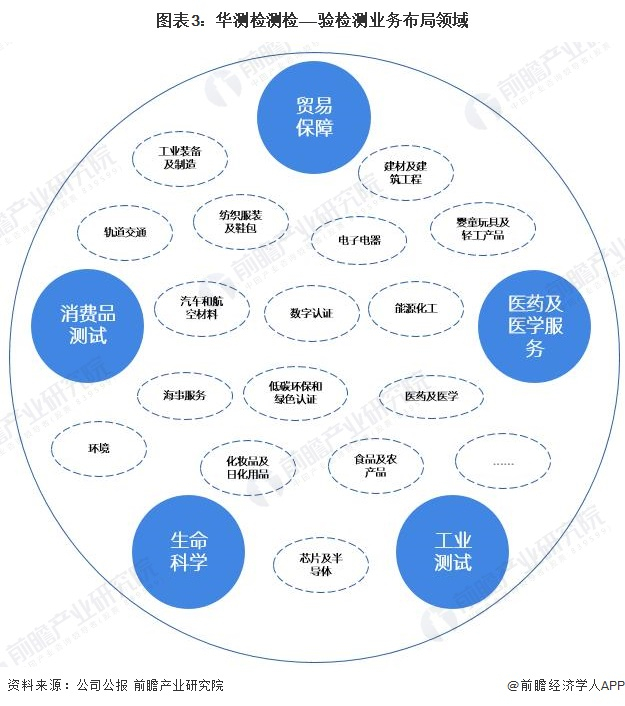 目前华测检测的检验检测业务按照行业可分为五大业务板块,分别为贸易保障、消费品测试、工业测试、生命科学、医药及医学服务。服务能力已经全面覆盖到纺织服装及鞋包、婴童玩具及轻工产品、电子电器、医药及医学、食品及农产品、化妆品及日化用品、能源化工、环境、建材及建筑工程、工业装备及制造、轨道交通、汽车和航空材料、芯片及半导体,低碳环保和绿色认证、海事服务、数字化认证等相关行业及其供应链上下游产业的服务。