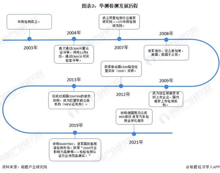 华测检测认证集团股份有限公司成立于2003年;2004首次通过CMA计量认证评审,同年11月9日,通过CNAL认可实验室评审;2007年成立民营检测行业首家研究院——CTI华测检测研究院;2009年成为创业板首家深圳上市企业,也是国内首家上市检测机构;2021年收购德国易马公司90%股份,进军汽车检测全球化服务。目前,华测检测已经成为我国行业领先的检测与认证服务企业。