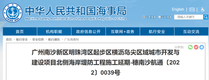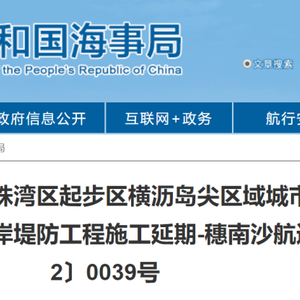 近日,国家海事局发布公告,横沥岛尖北侧海岸提防工程施工将延期。