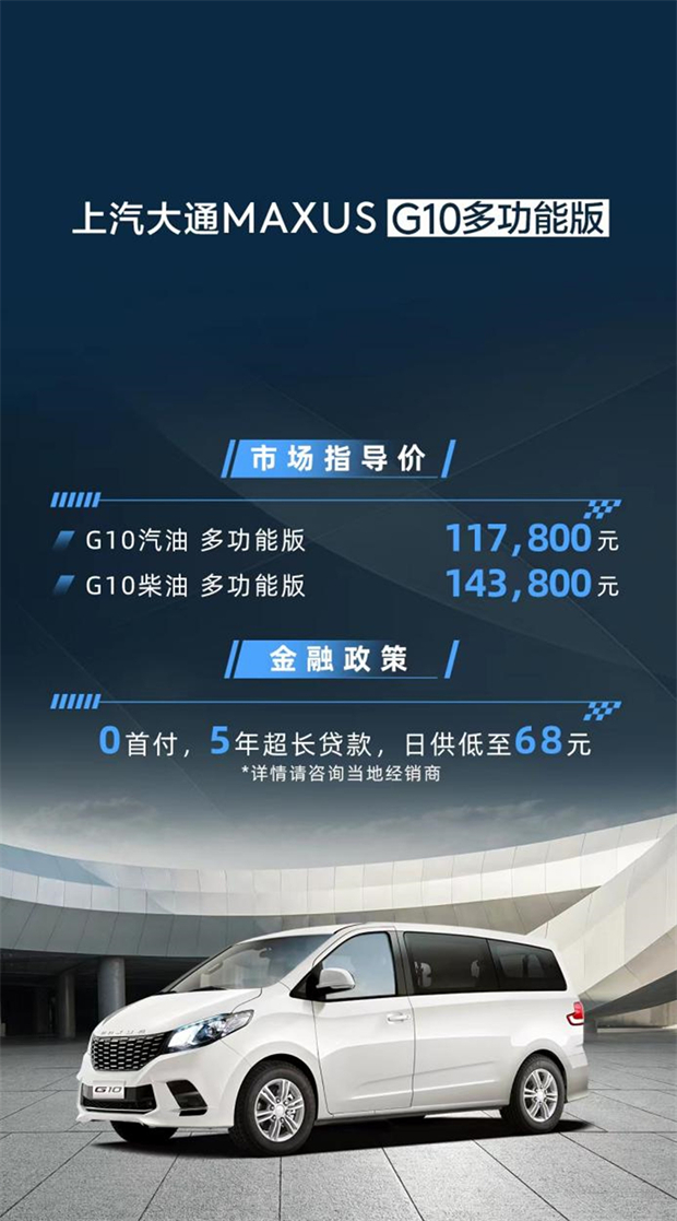 在持续升温的“全民创业潮”之下,对于奋斗在前线的青年创业者、生意个体户及工商业者来说,需要业务奔波、接待客户,也要兼顾家人朋友出行和自身的休闲爱好,而一辆时尚有面儿、大空间、乘坐舒适配置高且经济实用的座驾更成了刚需。作为“中国汽车定制专家”,上汽大通MAXUS为用户带来生意的得力助手、创业的务实之选!9月30日,上汽大通MAXUS重磅发布旗下中大型MPV G10多功能版,新车包括汽油版和柴油版两种动力选择,售价区间11.78-14.83万元,同时,上汽大通MAXUS还带来极具诚意的购车优惠政策:0首付、日供低至68元的5年超长贷款,助力用户创业之路省心无忧。
