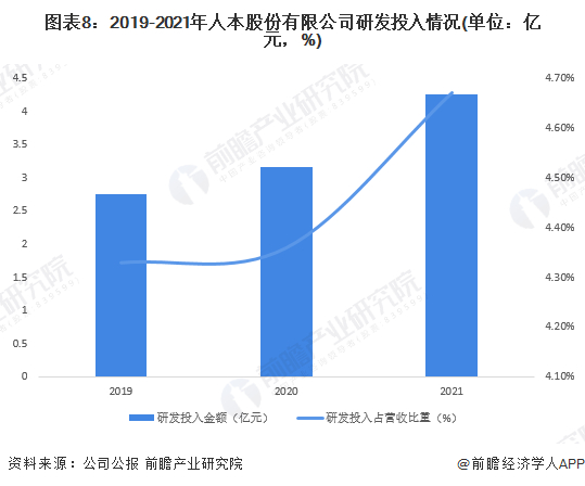 2019-2021年人本股份有限公司研发投入金额逐年增长,2021年达到4.26亿元,同比增长34.3%,研发投入占总营收比重同样逐年增长,2021年达到4.67%,同比增长0.31个百分点。