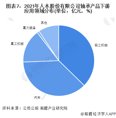 2021年,人本股份有限公司成品轴承产品主要应用于轻工机械和汽车领域,各领域轴承产品分别实现营业收入29.31亿元和29.08亿元,占营收比重分别达到32.78%和32.53%。