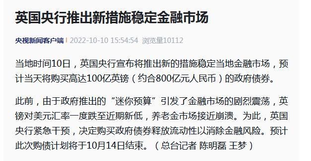 当地时间10日,英国央行宣布将推出新的措施稳定当地金融市场,预计当天将购买高达100亿英镑(约合800亿元人民币)的政府债券。