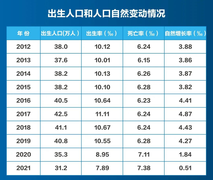 2014年,计划生育政策调整为放开“单独二孩”,2016年“全面二孩”政策实施,2021年“全面三孩”政策实施,出生率受到生育政策调整影响,在2012-2017年持续上升,2012年出生率是10.12‰,到2017年达到最高11.11‰,之后出现逐年下降,2020年和2021年受到“新冠”疫情、育龄妇女减少等综合因素影响,出生率分别是8.95‰和7.89‰。受人口老龄化影响,死亡率小幅上升,在7.38‰以内,自然增长率逐步降低,常住人口自然增长放缓。