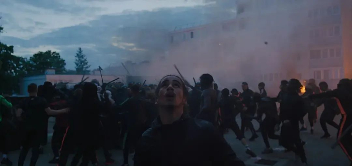 但几秒钟后,情况就完全转变了。人群聚集在雅典娜社区,其中有阿卜杜勒的另一个弟弟——愤怒但冷静得可怕的卡里姆(萨米·斯利曼饰)。卡里姆突然向人群中扔了一发燃烧弹,随即便引发了雅典娜的边缘化青年、法国当局和夹在中间的各种人群之间的激烈对峙。