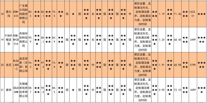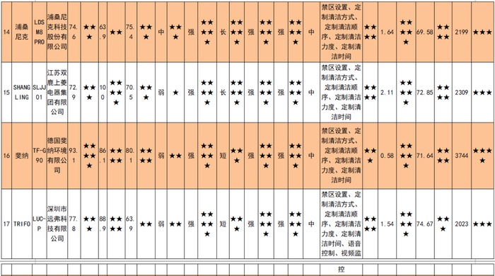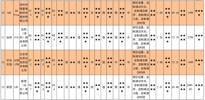 25款扫拖一体机样品情况及比较试验结果一览表