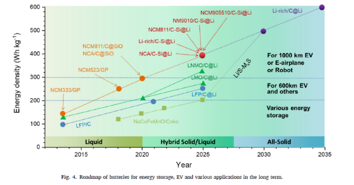 能量密度在200 Wh/kg以下的电池主要用于储能,而钠离子电池、磷酸铁锂、锰酸锂电池是主要的选择。电池的能量密度在200-300 Wh/kg之间,可以满足600公里的电动车和其它应用。具有竞争力的技术包括磷酸铁锂,锰酸锂,锂电池,低成本,安全。高能量密度电池(300-600 Wh/kg)能够满足长程电动汽车,电子飞机或者机器人的需要。可能的技术是高镍三元和富锂正极与高容量纳米硅/碳或锂-碳复合负极相结合。