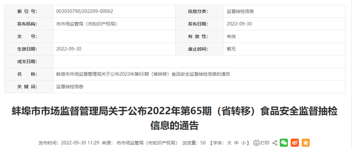 | 21 | / | / | 安徽家家悦真棒超市有限公司蚌埠吾悦广场店 | 安徽 | 香辣翅中 | 计量称重 | 2022-08-29 | 肉制品 | 安徽/省转移 | |