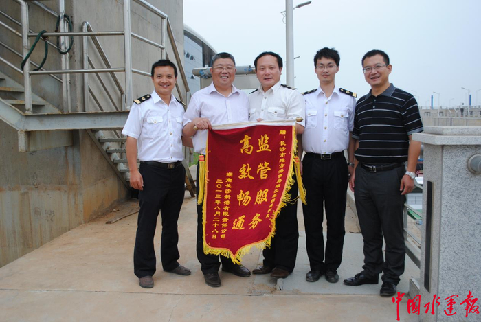 图为2013年8月30日,湖南长沙新港有限责任公司董事长唐忠良、董事辛华,将“监管服务,高效畅通”的锦旗赠给长沙市地方海事局湘江枢纽海事处。