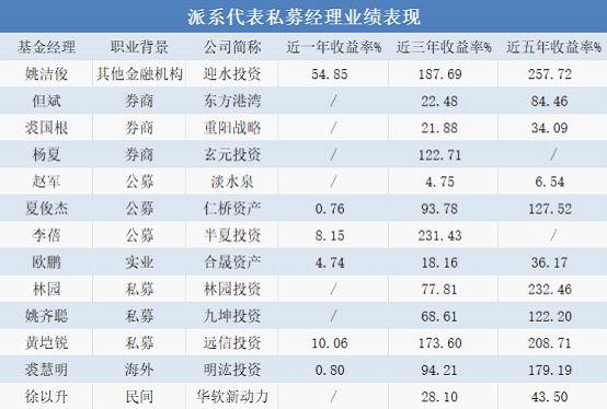 半夏投资的李蓓来自公募,旗下产品在近三年内收益率达到231.43%。此外,东方港湾的但斌、重阳战略的裘国根都有公募背景,其三年收益率分别为22.48%、21.88%。