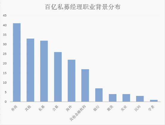 私募排排网数据显示,在参与统计的190名百亿私募基金经理中,有41位基金经理来自券商,32位基金经理稳居私募本身,26位基金经理来自公募,22位基金经理来自海外机构,17位基金经理来自其他金融机构。另有7位基金经理来自银行,4位基金经理来自期货行业,4位基金经理来自实业,3位基金经理来自民间,1位基金经理是学者身份,其余33位基金经理来自各行各业,归类于其他。