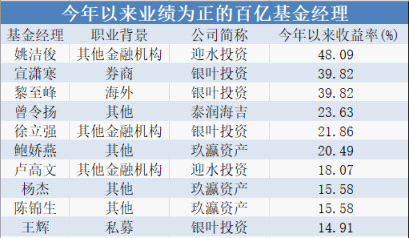 具体而言,今年以来收益率排名前十的私募基金经理,有来自其他金融机构的迎水投资的姚洁俊、卢高文,银叶投资徐立强;来自其他行业的泰润海吉曾令扬,玖瀛资产的鲍娇燕、杨杰、陈锦生;来自券商的银叶投资宣潇寒;来自海外的银叶投资黎至峰;还有来自私募本领域的银叶投资王辉。