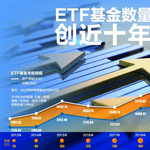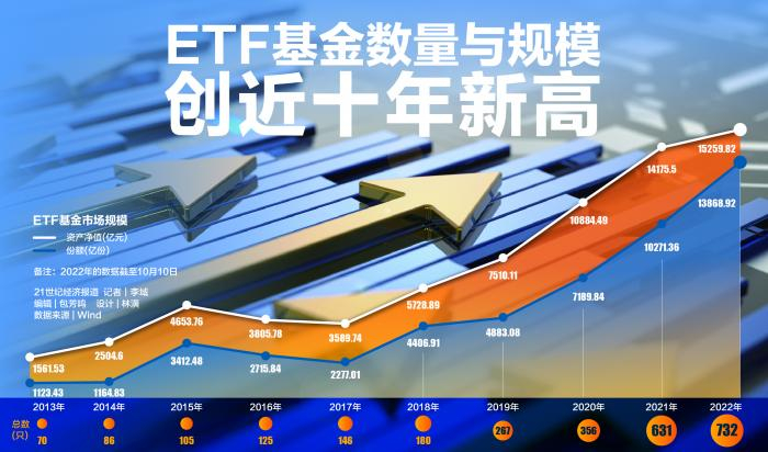 Wind数据显示,截至2022年10月10日, ETF基金产品数量和规模均创近十年来新高。其中,全市场ETF总共有732只,总份额为1.39万亿份,较上一年增长35%,资产净值达到1.53万亿元,较上一年增长8%。