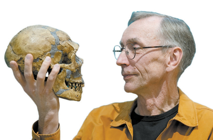 手持尼安德特人头骨复原模型的斯万特·佩博。
