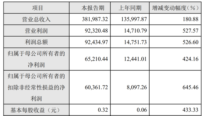 根据业绩快报显示,海光信息前三季度归属于母公司所有者的净利润6.52亿元,同比增长424.16%;营业收入38.2亿元,同比增长180.88%;基本每股收益0.32元,同比增长433.33%。